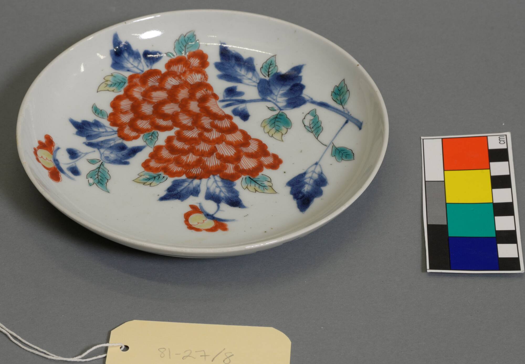 DescriptionDecorated with peony spray with the stem and some leaves in blurred underglaze blue, the blossom and bud in bright iron-red overglaze enamels with other leaves in green and yellow enamel; exterior decorated with running scrolling and lines in underglaze blue.