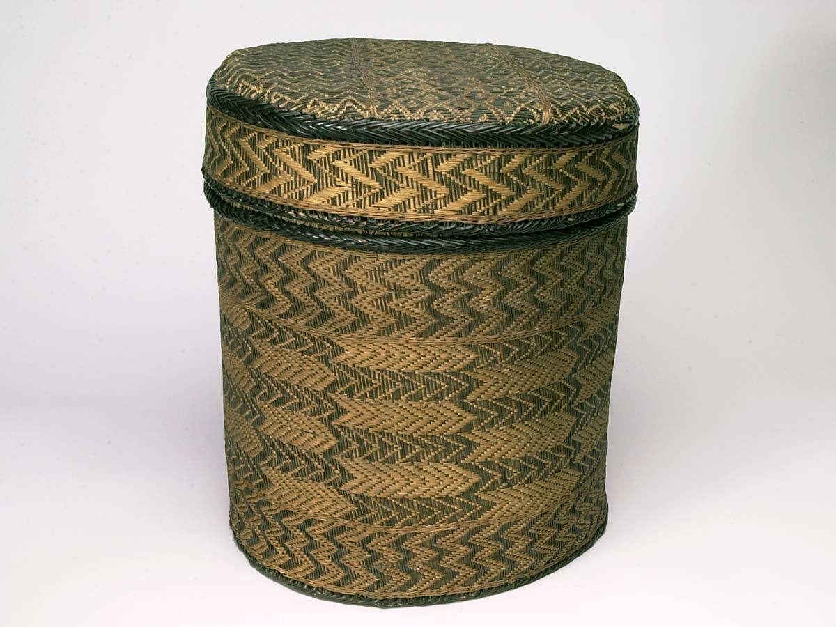 DescriptionLidded container with wooden bottom and top (to lid). top are woven basketry with finer woven decorative twill plaiting covering sides of basket and sides and top of lid. Central design bracketed by two identical designs on top of lid and sides of container.ProvenanceChloe McLellan Pierce (1816-1909), Edgartown, MA, by 1909 [1];