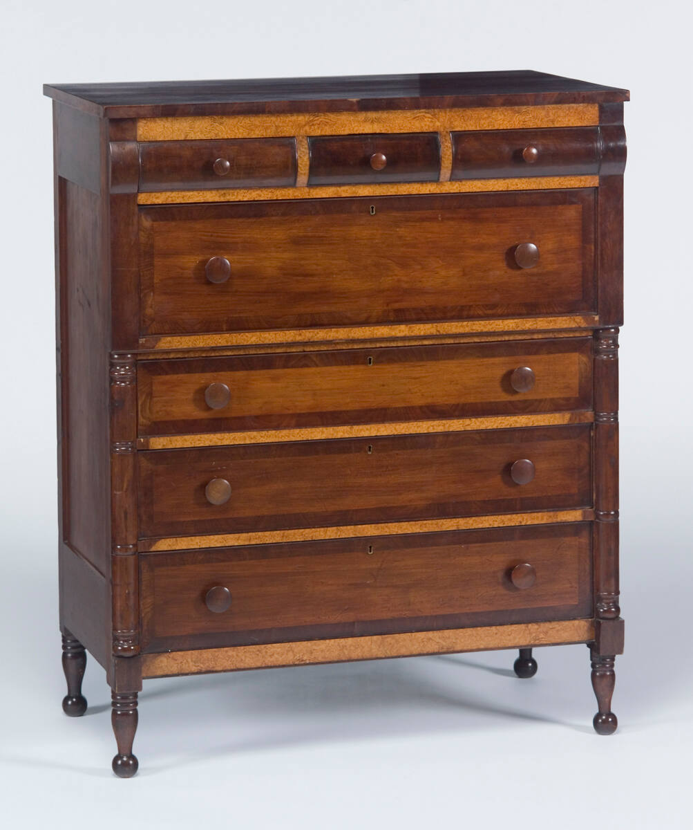 DescriptionFour large drawers and three small drawers (across the top). Light inlaid trim on front surface.