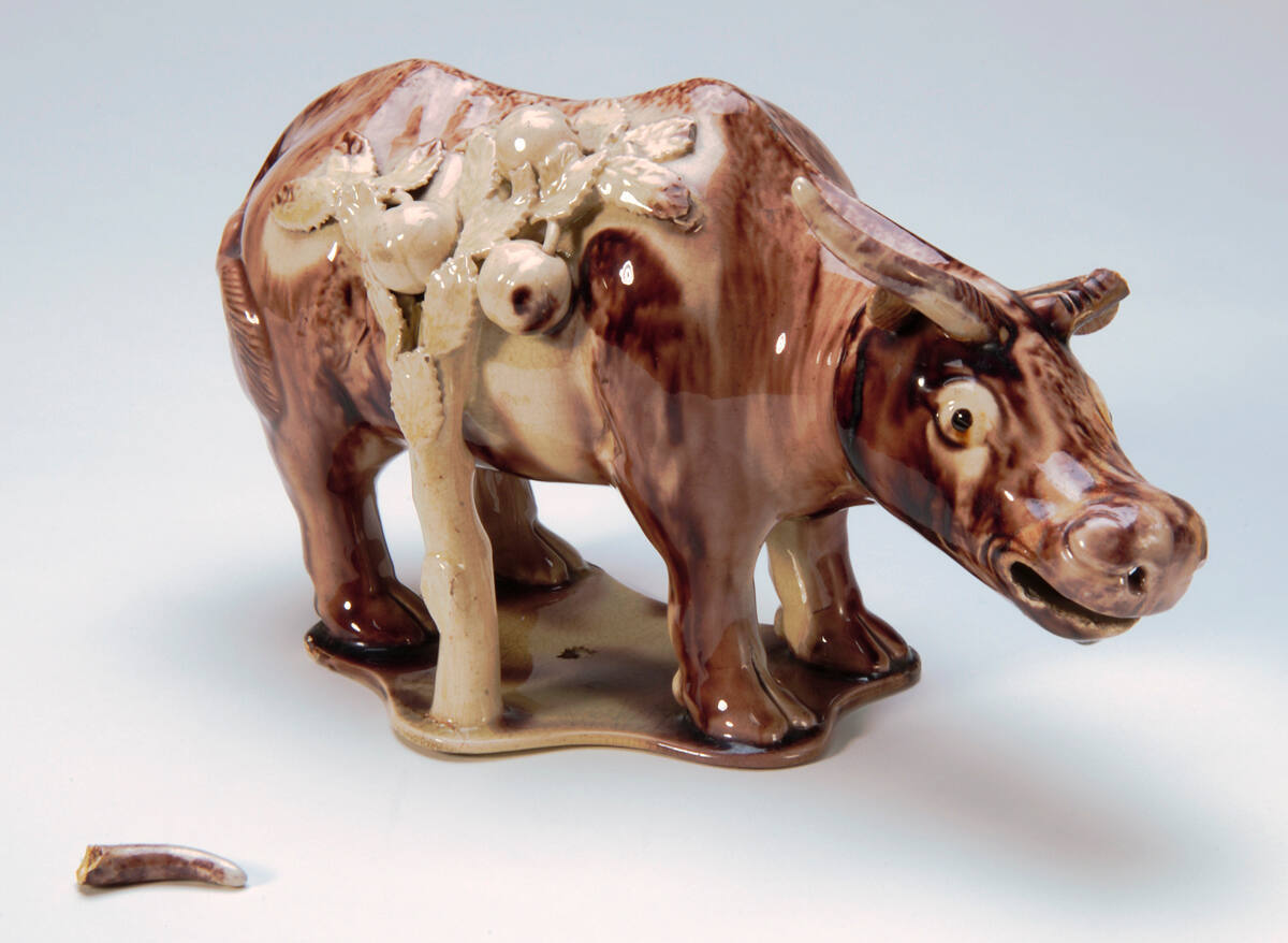 DescriptionStanding on a shaped-shallow base, figure of buffalo glazed in mottled manganese over cream, beside cream glazed peach tree, the leaves and fruit of which arch over his right side. Buffalo with open mouth, wide-spread horns, tail in relief.