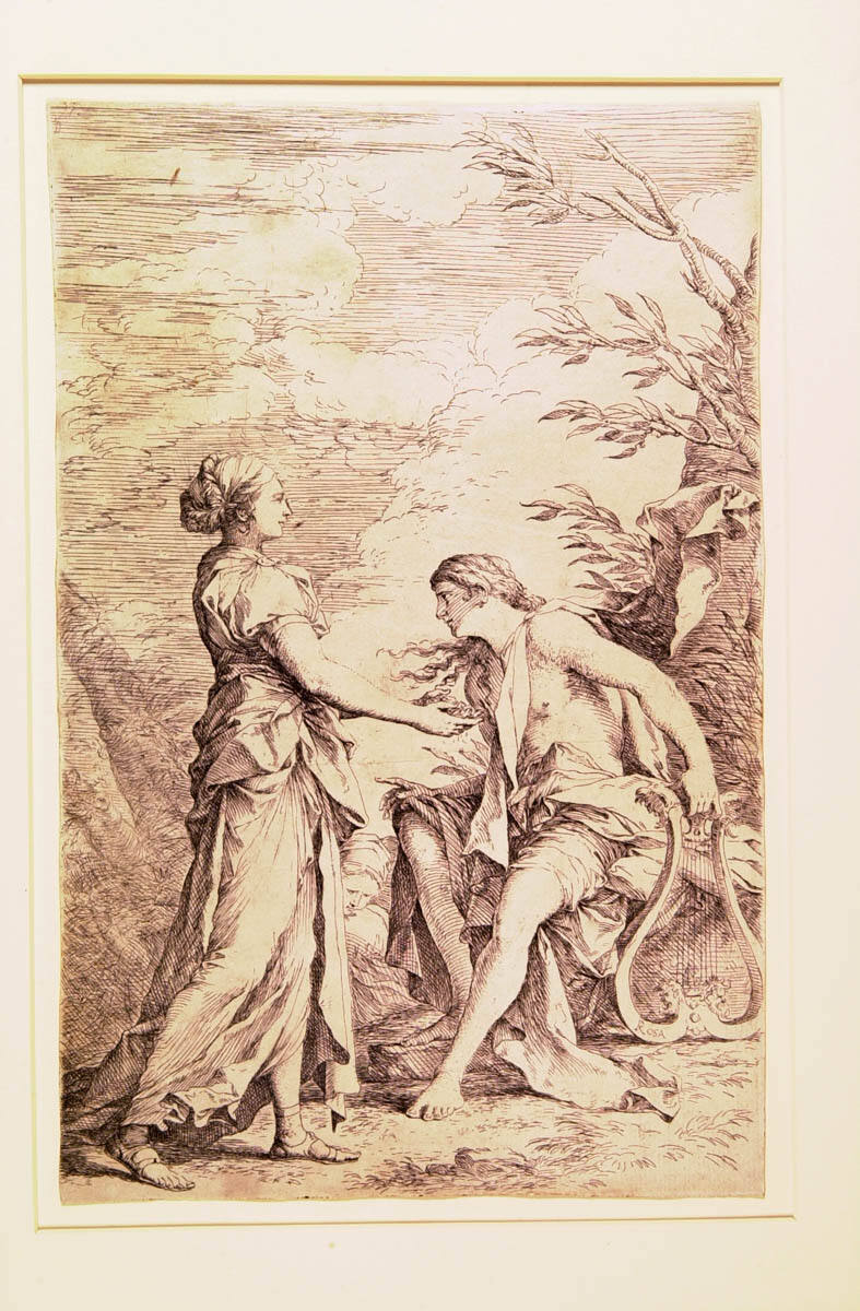 Apollo, the son of Zeus, became enamored of the Cumaean Sibyl, one of the ten cave-dwelling oracles of the ancient world. Apollo agreed to give her anything she wished, so she asked him for as many years of life as the grains of sand she held in her hand. Long life was granted to her, but unfortunately without the gift of eternal youth. The Cumaean Sibyl was assumed to be 700 years old when she guided Aeneas on his journey in the underworld. The celebrated musician Apollo is shown accompanied by his lyre.