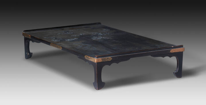 DescriptionDark brown lacquer ground, the top decorated with a lake scene of clouds, rock and water, wisteria and pomegranate, in low relief lacquered with plain gold and silver, corners and center of edge decorated with gold lacquer floral bands in imitation of gilt metal fittings.ProvenanceWith Z. Tsushima, Kyoto, by April 15, 1972;