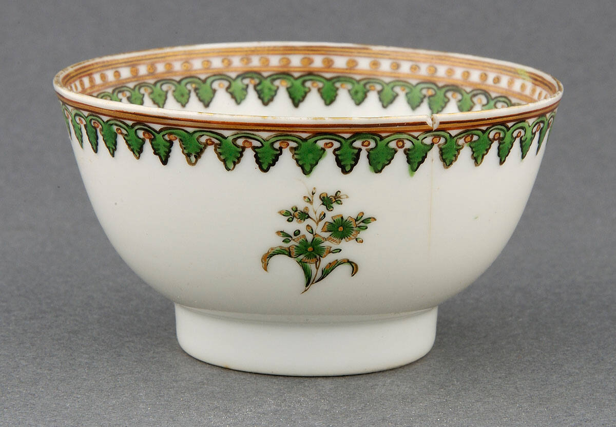 DescriptionCup without handle: white porcelain decorated with a band of enameled green and gold leaf designs on the inside and outside edges. On one side is a wreath encircling the initials DLCT.ProvenanceMargaret Cameron Chapman (née Mann, 1865-1935), Kansas City, MO, by 1935;