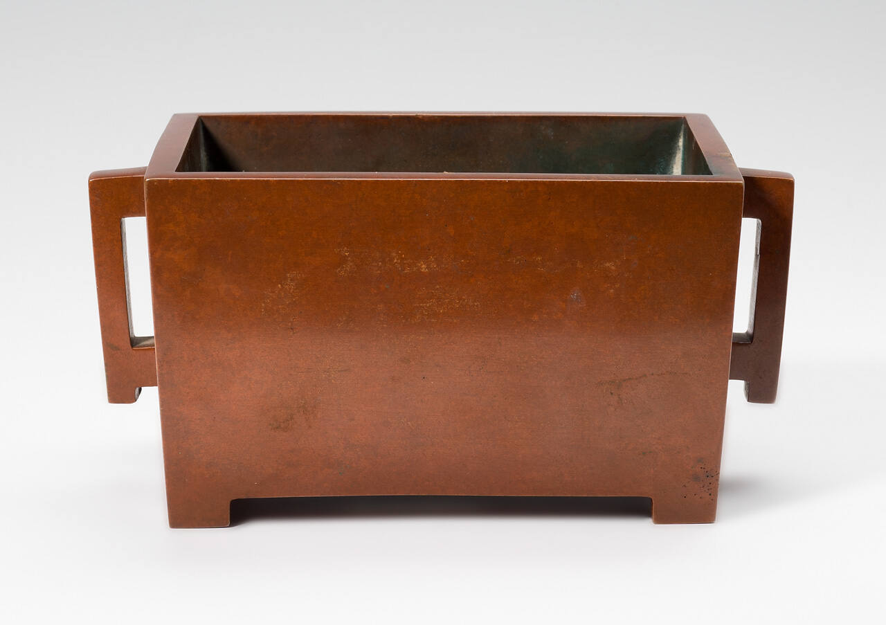 DescriptionRectangular vessel with four feet and two vertical rectangular handles on short ends. The censer has a rust-colored mottled patina with traces of gold flecks over most of the body. Interior has a green patina and whitish material from burning materials.