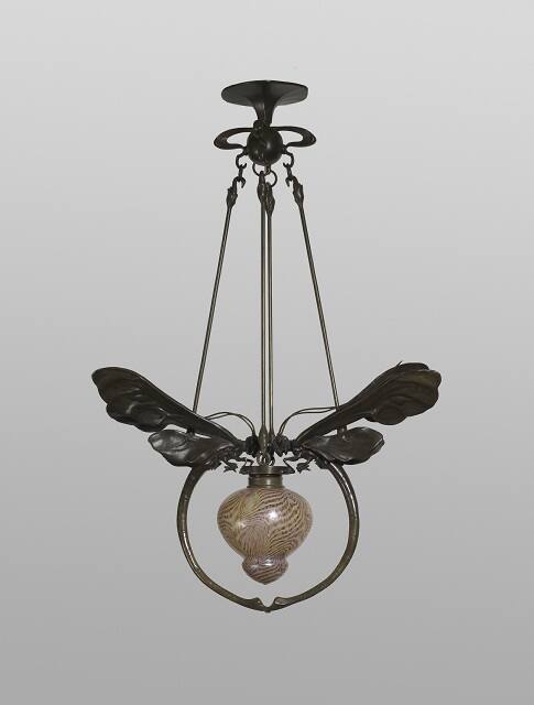 DescriptionElectrified hanging lamp of two bronze dragonflies, head-to-head, with a dark green patina enclosing an iridescent brownish-gold glass globe. The chandelier descends from the ceiling from a bronze mount of slightly undulating form from which is attached four loops, also of bronze, encompassing a sphere. Four hooks are attached to the sphere. These hooks each connect to a ring from which are suspended four bronze arms, with a hook on each end, secured into rings on the back of each dragonfly and to the bronze mount of the glass globe. The globe screws into the bronze mount and is of a pendant, tear-drop shape.
