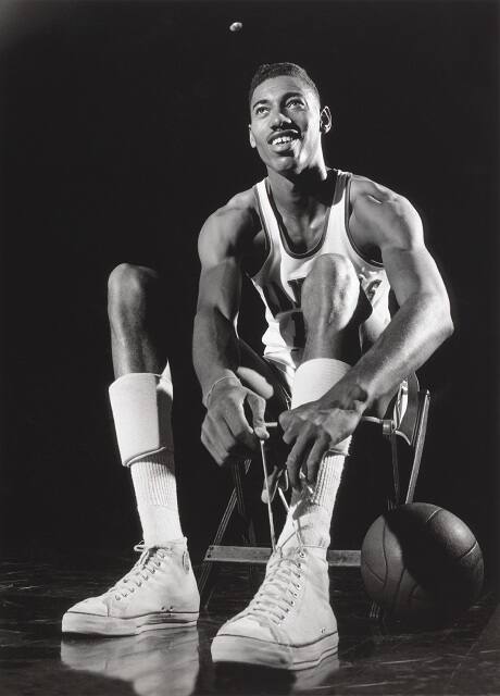 DescriptionA smiling Wilt Chamberlain in his basketball uniform looks up as he sits on a folding chair tying his left shoelace. A basketball rests on the floor to his left. The athlete's incredibly long arms and legs and his huge hands and feet dominate the image and make the chair look diminutive by comparison.Exhibition HistoryIn the Public Eye: Photography and Fame. The Nelson-Atkins Museum of Art, Kansas City, MO, March 8 - June 15, 2008, no cat.