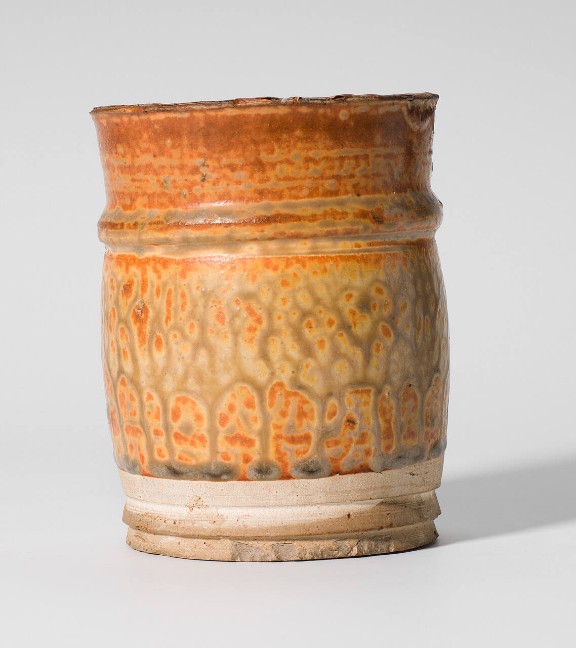 DescriptionCup with slightly bulging sides. Raised band below lip and beveled foot. Yellow and green-gray glaze over white slip.