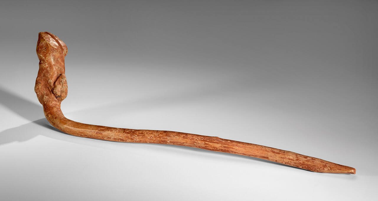 DescriptionShort staff, formed of a cingle piece of wood, the upper end terminating in the rudimentary carving of an animal's hoof. Pale red paint overall.