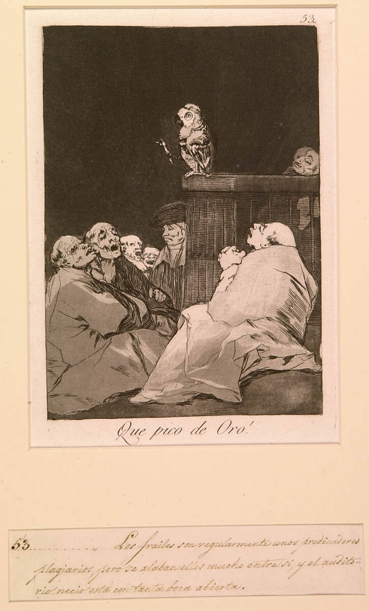 Pierre Gassier and Juliet Wilson-Bareau, The Life and Complete Work of Francisco Goya, 2nd ed. (New York: Harrison House, 1981), no. 557, pp. 130, 182, (repro.), as Que pico de Oro! (What a golden beak!).