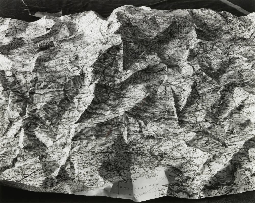 DescriptionImage of a crumpled paper map with dark shadows cast across it, Mϋnchen identified in the upper left corner.Gallery LabelIn this image, a crumpled map, composed and lit to illuminate its three-dimensionality, becomes a landscape in its own right. Abelardo Morell reveals a fascination with the camera’s ability to transform familiar things in remarkably fresh ways.