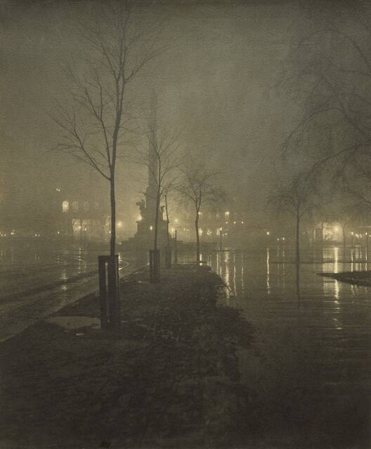 This work celebrates the atmospheric effects of the relatively new invention of electric light illuminating the rain-soaked streets of New York City at night. William A. Fraser was one of the first photographers to fully explore the artistic potential of night photography. Critics praised this photograph as both a technical and artistic triumph when it was first exhibited in 1898.