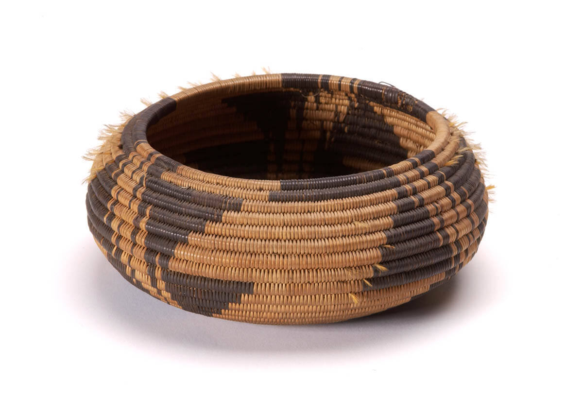DescriptionThree black designs on natural with orange dyed horse's hair in tufts.