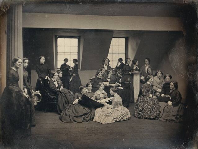 DescriptionImage of a group of young women in 19th century style dresses in a sparse room with two windows. Several women in the center of the image are reading from a very large book which takes two women to hold open. This full plate uncased daguerreotype is housed in an object package without a mat.Gallery LabelThis portrait features twenty-five students from the Emerson School for Girls, posed in the studio of Southworth & Hawes. Lyrically arranged in small groupings, the women convey individuality through gesture and pose, but come together as a beautifully orchestrated whole.