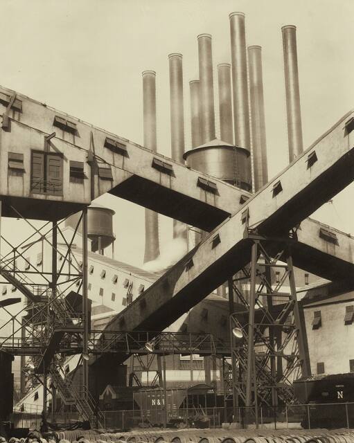 DescriptionImage of an industrial complex with two conveyors crossing over one another and a metal staircase beneath.Gallery LabelCharles Sheeler's work in both painting and photography reflected his fascination with the logic of structure, the way in which cultural values are expressed in architectural form. Sheeler's most memorable photographic project was his 1927 series at the Ford Motor Company plant outside Detroit. Sheeler spent six weeks exploring the vast site before making 32 photographs. Here, Sheeler records aerial coal and coke conveyor lines crossing in midair, the plant's water tanks just behind them and the towering smokestacks of Power House No. 1 in the distance. The result is an iconic expression of a peculiarly modern idea: the industrial sublime.