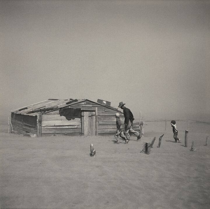 InscribedOn mount verso, bottom, in pencil: "Farmer + Sons Walrey in dust storm, Cimarron Co. Okla - April 1936"