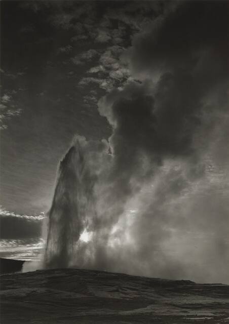 Ansel Adams worked in a sharp, technically flawless modernist style. Most of his work was devoted to the natural landscape. Typically, he depicted moments of heightened visual and emotional experience. The drama of the geyser Adams captured here shows his interest in the fleeting effects of light and atmosphere.