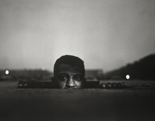 DescriptionImage of a man emerging from an opening in the road; his face is cropped below his nose. Two small bright lights appear on either side of him in the background.Gallery LabelBorn in Fort Scott, Kansas, Gordon Parks became a celebrated photographer, writer, musician and filmmaker. In his work for Life magazine, between 1948 and 1961, he photographed everything from Harlem street gangs to Paris fashions. This image was inspired by Ralph Ellison's great book Invisible Man (1952). Ellison's novel explores the quest for identity of an unnamed African American protagonist who lives alone in an underground room, his invisibility the result of a society that refuses to acknowledge his existence. Parks' photograph of a figure emerging from a manhole-a poetic fiction created in collaboration with Ellison-powerfully evokes this sense of emotional isolation.