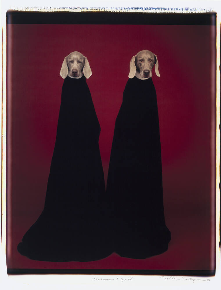 In Innocence and Guilt, William Wegman presents his canine collaborators as symbolic representations of “good dog” and “bad dog.” Sitting on pedestals and cloaked in black, the two dogs convey near identical attitudes, leaving the viewer to discern what might account for their assigned innocence and guilt. Wegman’s 20 x 24- inch Polaroid prints of his Weimaraners—Man Ray, Fay, and her offspring—parody real or imagined motifs from art history, humorously subverting the traditions of Euro-American portraiture.
