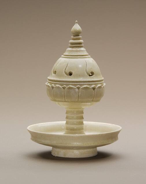 DescriptionA miniature pierced lotus-bud form censer on dish support.ProvenanceJ. J. Lally & Co.;
