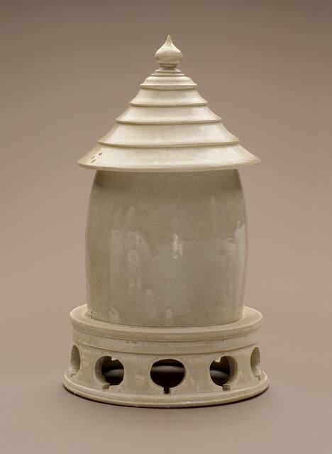 DescriptionA miniature model of a granary, tall rounded form with incised door above the openwork platform base and fitted removable high pointed roof with lotus bud finial.