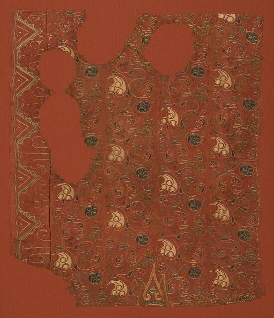 DescriptionThe rectangular silk embroidery is now mounted on a red cotton fabric. The silk is embroidered in delicate chainstitch using white, yellow, green, light- and dark-blue silk thread over a plainly woven red silk tabby. The chainstitches create the repeating patterns of white scrolling clouds and dark-blue disks over the background of spiral motifs. A border remaining in one of the long edges is designed with a saw-tooth pattern and spiral patterns. A scrolling mountain form remains on one of the short edges, in which the cutting suggests that this mountain motif was one part of a larger design. The silk retains the brightness of colors. The embroidery has losses in several areas.ProvenanceArthur Leeper Asian Art;