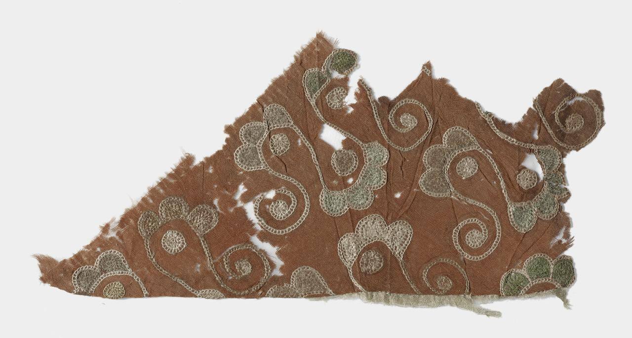 DescriptionThe small, irregular-shaped silk is embroidered in chainstitch using white, yellow, gree, light-and dark-blue silk thread over a plainly woven dark-brown silk tabby. The chainstitches create the repeating patterns, each of which is a curvy "M" shape with small lobes on the curves and spirals at two ends. The silk embroidery has retained its bright colors.