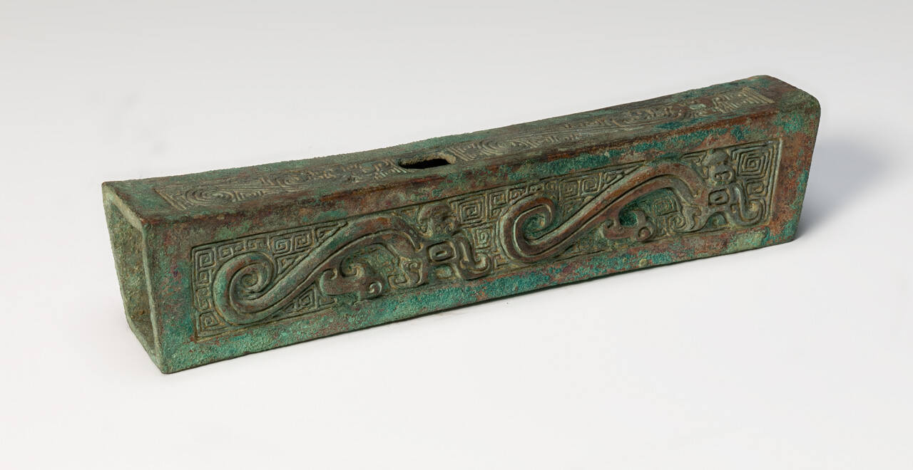 DescriptionShaft decoration. Irregular rectangular hollow bronze with one end closed, dragons in incised and relief design; two holes for pins.ProvenanceT'ang Hsiao Wu, Peiping (modern-day Beijing), China, by March 30, 1934;