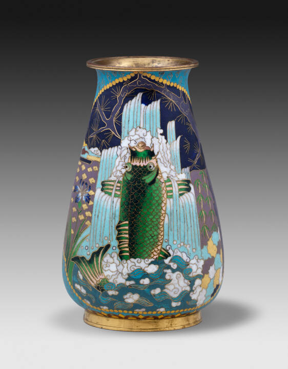 DescriptionThe vase's baluster-shaped profile curves outward from the base and taper inward at the top. The lip and the base of the vases are gilded metal. The images placed on opposite sides depict a large fish with scales in tones of green swimming upward into a white and pale blue waterfall, and branches of chrysanthemums in brick red, white, yellow, deep blue, and orange with green leaves and brown stems against a turquoise-blue background.Gallery LabelEurope meets Asia in these vividly colored vases. A Japanese-inspired image of a carp against a waterfall decorates one vase, while the other shows a traditional European depiction of nature. In the 1860s and 1870s, Asian goods such as cloisonné enamels (metal forms covered with enamel-filled metal wire cells) flooded Western markets. This stimulated international curiosity and fueled a desire for Asian products. As a result, European and American manufacturers were quick to imitate them.