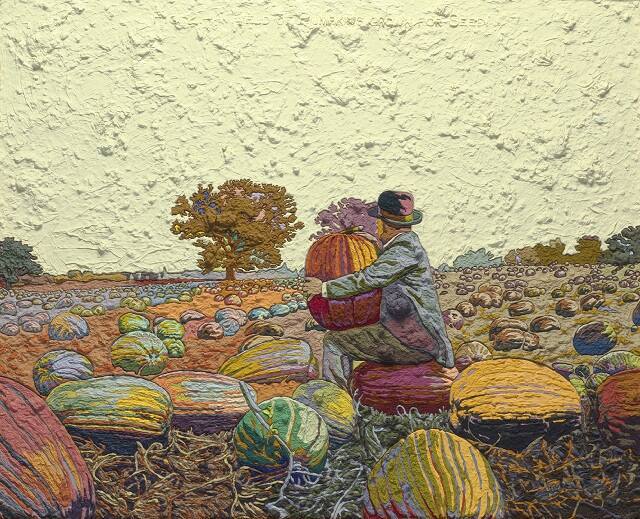 DescriptionThis heavily textured and vividly colored painting depicts a man sitting on a pumpkin in a field of pumpkins. He is holding a pumpkin, resting it on his knees, with his head turned away from the viewer looking toward trees in the distance.Gallery LabelFigure 2--A Field of Pumpkins Grown for Seed: Translation #11 is part of a visionary series titled Translations. A man sits atop a huge pumpkin, while also holding one in his arms. He gazes at the distant horizon. The painting is infused with mystical light, and its exaggerated colors lend it a hallucinatory quality.