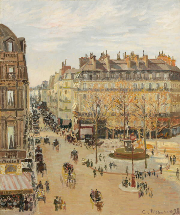 Camille Pissarro depicted a bird’s-eye view of the tiny figures and carriages that animated the streets and sidewalks at a busy intersection in the heart of Paris. To emphasize the verticality of the buildings, he cropped the facade of the structure at far left.