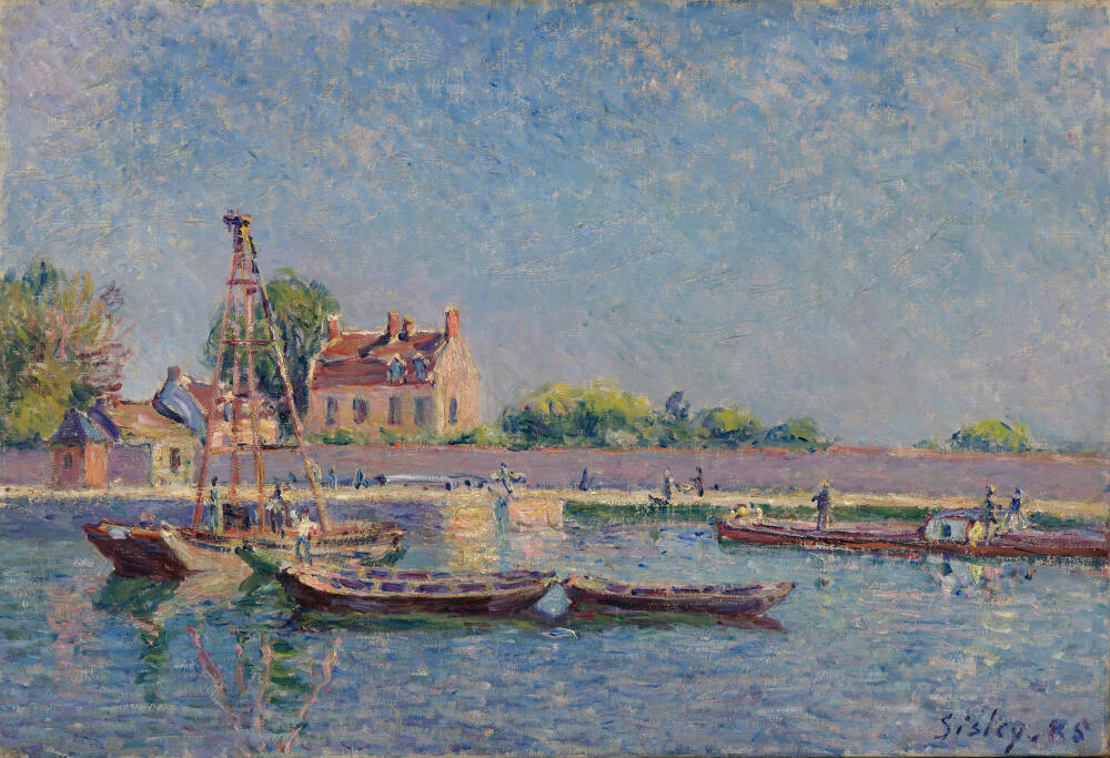 Alfred Sisley produced a significant series of paintings dedicated to the constant flow of river traffic near Saint-Mammès, a town southeast of Paris. Here, the subject is the energy and movement of the riverfront, which is matched in intensity by the bright palette and quivering brushstrokes that evoke light reflecting off water. Sisley’s scene captures the forces of modern commerce and industry that rapidly transformed France’s countryside in the mid- and late 1800s.
