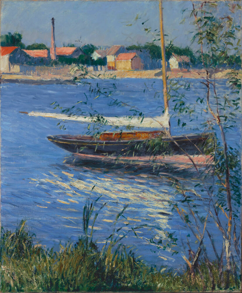 In this work, the subject is one of Caillebotte’s lightweight sailboats moored on the Seine in front of his home. Caillebotte devoted marked attention to capturing the brilliant reflection of light dancing on the water, rendered in thick strokes of white paint.