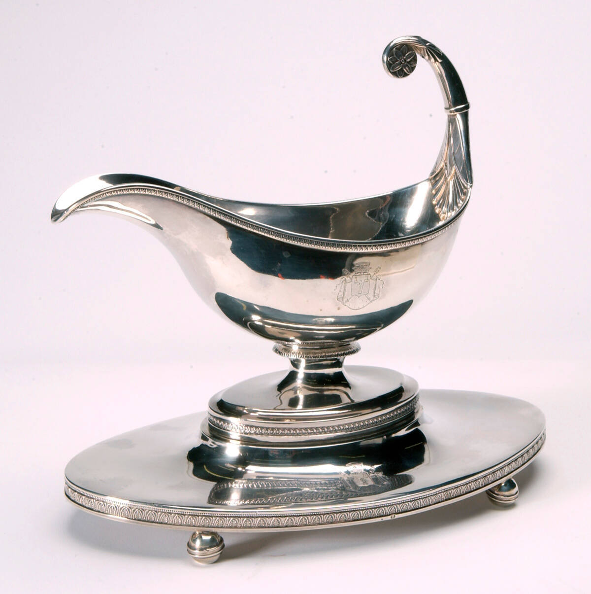 MarkingsArms of Dambray of Normandy. (See accession file for more information.) On boat, near handle - one horizontal and one round punch, both illegible; at base of boat - circular mark with profile facing right; underside of stand - oval punch with classical head of woman (dated after 1783), diamond punch with letters LL, fleur de lis and star, octagonal punch with rooster (Paris, 1st standard mark, 1819); on stand - below anthemion border, circular mark with profile and smaller illegible mark.