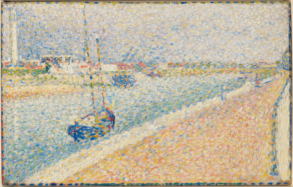 Working outdoors on this preparatory oil sketch for a larger oil painting, Georges Seurat focused on applying the latest scientific theories about optics and color. He pioneered a technique of methodically placing individual units of pure color side by side. In addition to the dotted style, known as Pointillism, Seurat employed complementary colors (opposites on the color wheel) in pursuit of maximum vibrancy. Here, he used a vivid interplay of complementary blues and oranges to animate his otherwise tranquil harbor view.
