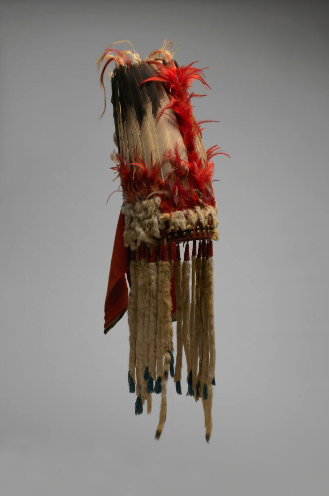 MediumEagle and hackle feathers, ermine skin, rawhide, wool cloth and yarn, cotton cloth, brass buttons, wood, and dyed horsehair