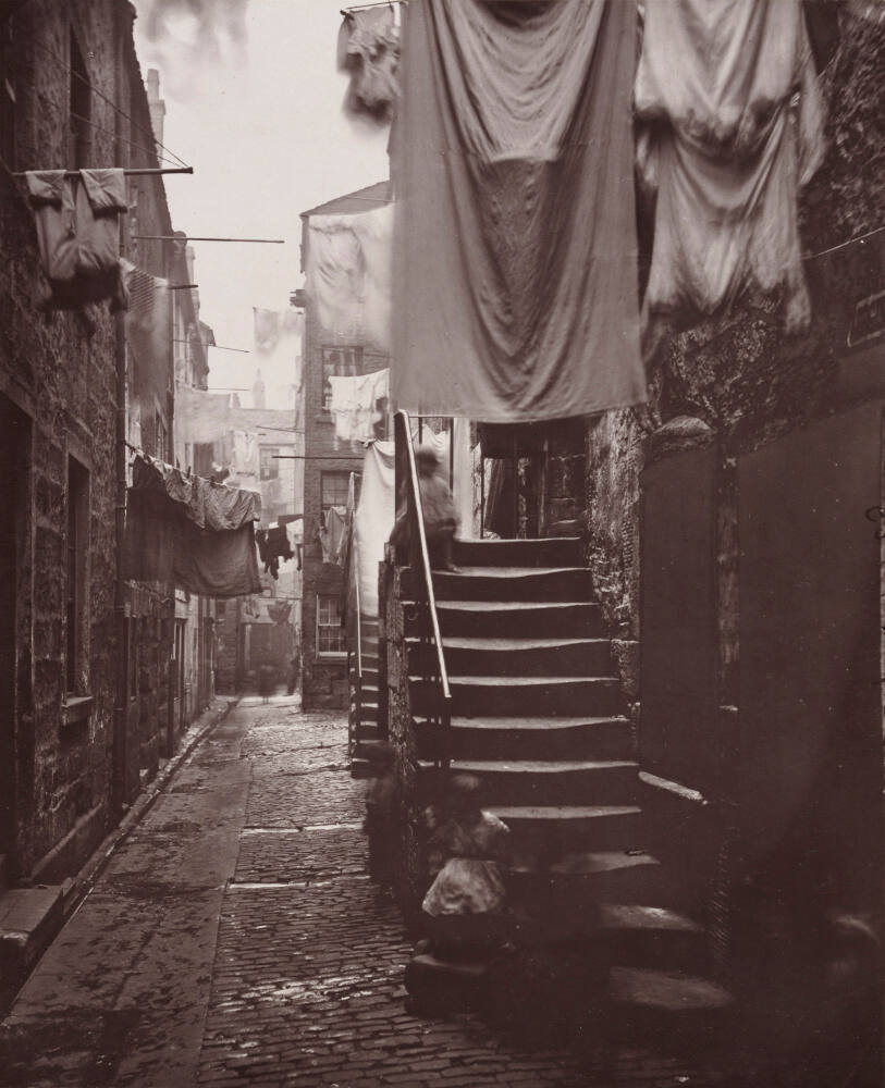 DescriptionImage of children (blurry) seated on an exterior staircase in an alley. Laundry is draped over poles which extend out of windows and across the alley.Gallery LabelIn the decades prior to the 1860s, Glasgow’s population grew rapidly. Slums increasingly posed a health and safety hazard, prompting the Scottish government to embark on a large urban-renewal project. The Glasgow City Improvement Trust hired Thomas Annan to document dirty and congested areas such as this close (a road closed at one end) prior to demolition. Here, as in other works from this series, Annan’s lengthy exposure allowed most passersby to blur into invisibility.