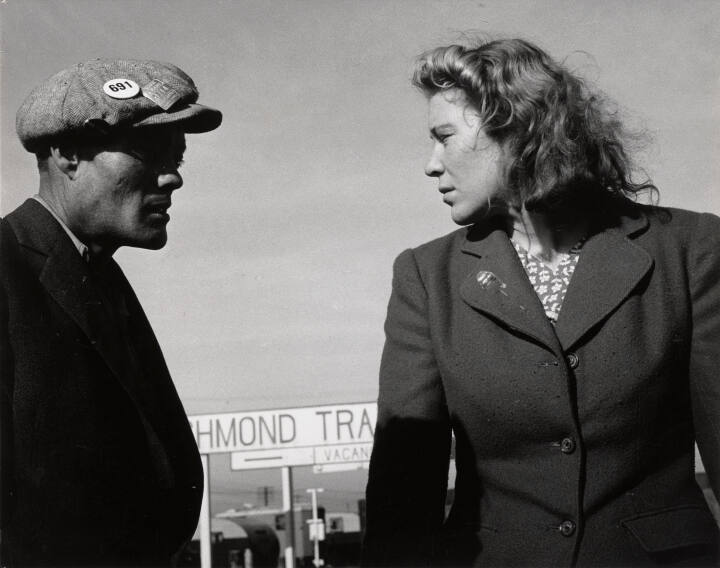 DescriptionImage of man & woman arguing in front of a trailer court.Copyright© The Dorothea Lange Collection, Oakland Museum of California