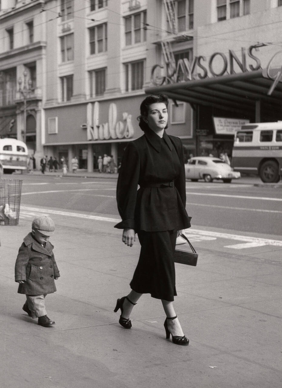 DescriptionImage of a woman, carrying a purse, walking down the sidewalk with a small child following behind her.Gallery LabelThis image of a woman and child on the streets of San Francisco conveys Dorothea Lange’s abiding interest in relationships between people. She began exploring the subject early in her career when she travelled throughout the country on government-sponsored assignments to document poverty during the Great Depression and the imprisonment of Japanese Americans during World War II. After the war, Lange photographed closer to home in San Francisco, as travel became difficult after she began to suffer from the long-term effects of polio, which she contracted as a child.