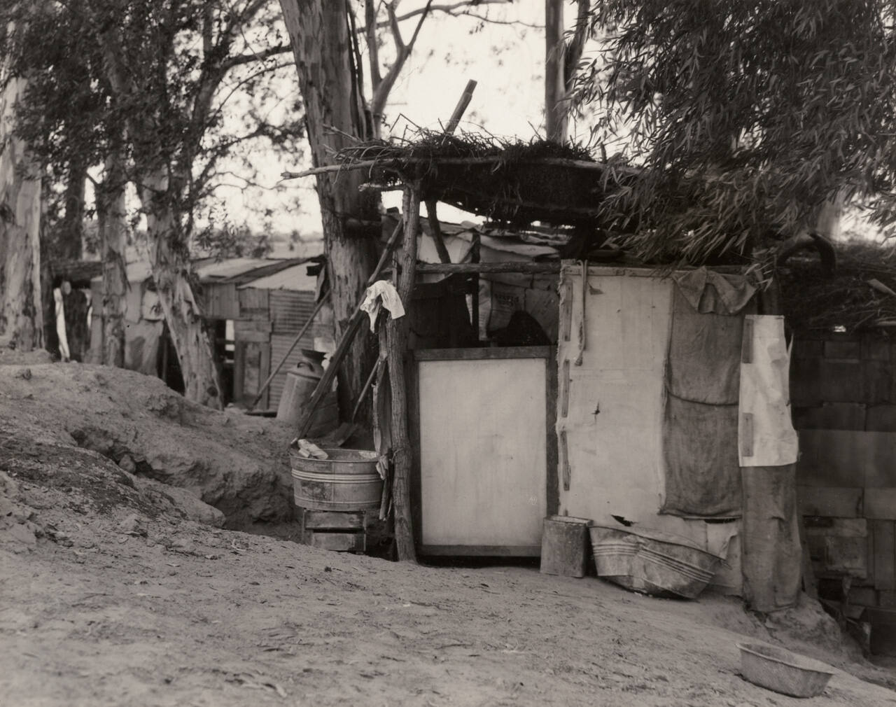 DescriptionVintage gelatin silver print mounted on spiral ring-bound board; image of a 'squatter's camp',Exhibition HistoryDignity vs. Despair: Dorothea Lange and the Depression Era Photographers, 1933-1941. The Nelson-Atkins Museum of Art, Kansas City, MO, June 23 – November 26, 2017, no cat.
