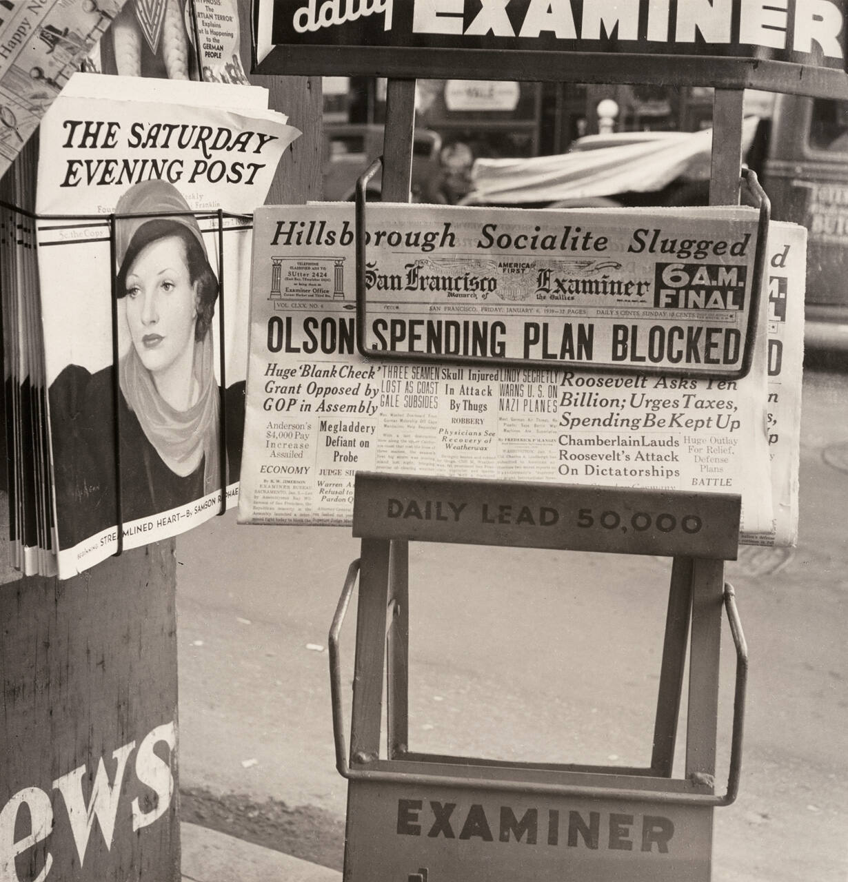 DescriptionImage of a newpaper stand with the San Francisco Examiner and The Saturday Evening Post displayed.Copyright© The Dorothea Lange Collection, Oakland Museum of California