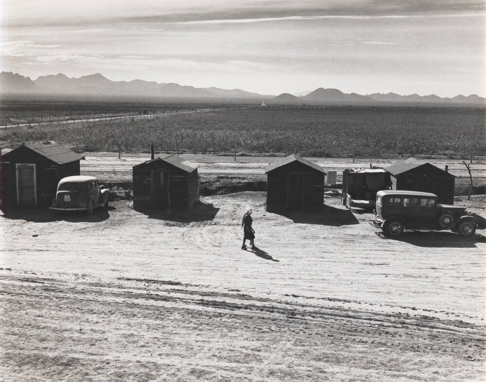 DescriptionImage of a woman in profile walking through a sandy landscape with a row of four small structures and two cars. Farmland and mountains are in the background.Exhibition HistoryDignity vs. Despair: Dorothea Lange and the Depression Era Photographers, 1933-1941. The Nelson-Atkins Museum of Art, Kansas City, MO, June 23 – November 26, 2017, no cat.