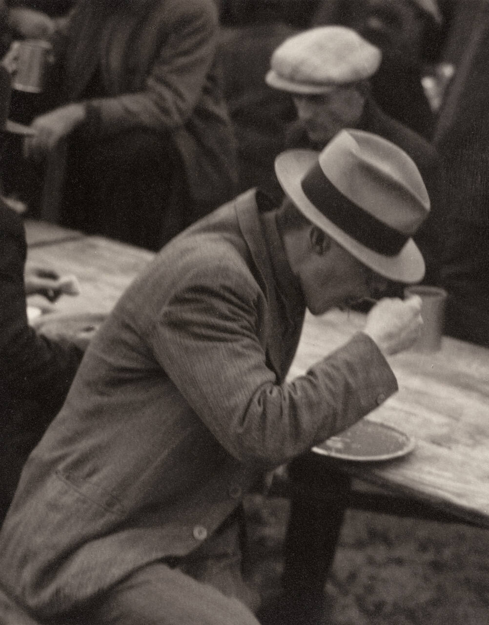 DescriptionImage of several men, allwearing hats standing closely together with their backs towards the viewer in the background. In the foreground, one man faces the viewer. He is leaning against one of two wooden boards that cuts across the bottom third of the frame. His face is partially covered by a light colored, but soiled, hat. His hands are folded together. A metal cup rest on the board between his arms.Exhibition HistoryRotation 18. The Nelson Atkins Museum of Art, Kansas City, MO, December 17, 2014 – May 3, 2015, no cat.