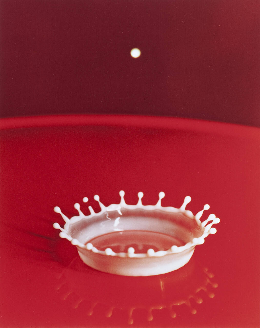 While teaching as a professor of electrical engineering at the Massachusetts Institute of Technology, Harold Edgerton invented a technique to record scientific phenomena that would otherwise be invisible to the human eye. To achieve this, Edgerton used stroboscopic photography, combining ultra-high shutter speeds with bursts of flash to "freeze" movement. Edgerton produced a black and white image of a milk drop falling into a pool of the liquid in 1936, recreating the experiment in vibrant color (pictured here) in 1957.