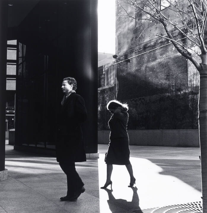 Ray Metzker's black and white photographs strike a unique balance between formal brilliance, optical innovation and a deep human regard for the objective world. A student at the acclaimed Institute of Design in Chicago in the late 1950s, Metzker studied with the legendary teaching team of Aaron Siskind and Harry Callahan. In this urban street scene, Metzker brilliantly divides the picture into two separate but related components, creating a powerful interplay of opposites: light and shadow, black and white, male and female.