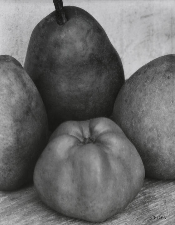 An experimental work created while Edward Steichen was living in France after World War I, this photograph was made under very dim light, with the camera's shutter open for 36 hours: a full day, a night and part of the following day. The soft, directionless light gives these simple forms a powerfully sculptural presence; they are rendered as iconic, even heroic, objects. Further, the lengthy exposure and fluctuating temperatures from day to night lend a kind of animation to these still forms. For example, close examination reveals that the foreground apple has a slightly blurred, or doubled, outline: a result of its slight contraction and expansion in the changing temperature of Steichen's greenhouse.
