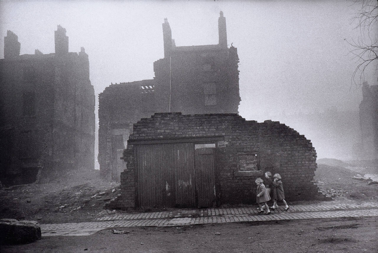 Scarred by bombing, invasion, and economic destabilization, the urban landscape of post-World War II Europe was radically different than that of the United States. Here, French photographer Henri Cartier-Bresson captures three young girls passing crumbled buildings in Liverpool, England, contrasting the city’s future with its prolonged recovery from a difficult past.