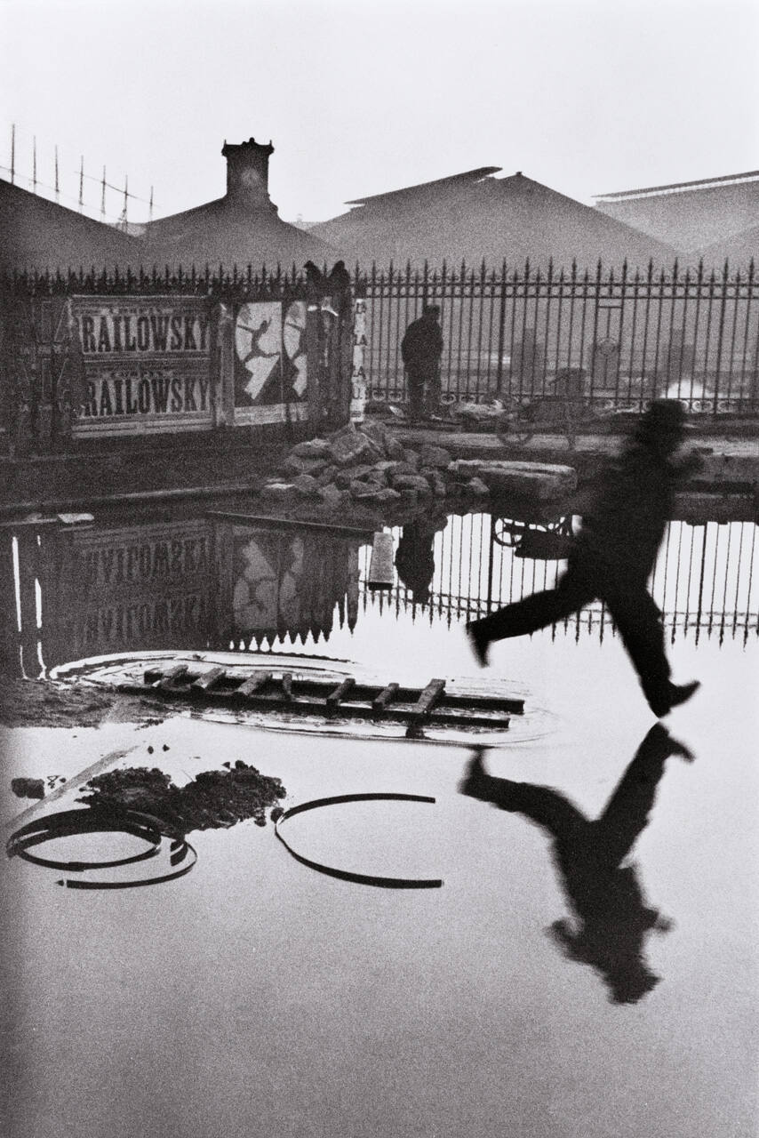 “There was a plank fence around some repairs behind the Gare Lazare [train station], and I was peeking through the spaces with my camera eye,” Henri Cartier-Bresson later recalled about the moment he took this photograph. “This is what I saw. The space between the planks was not entirely wide enough for my lens, which is the reason the picture is cut off on the left.”