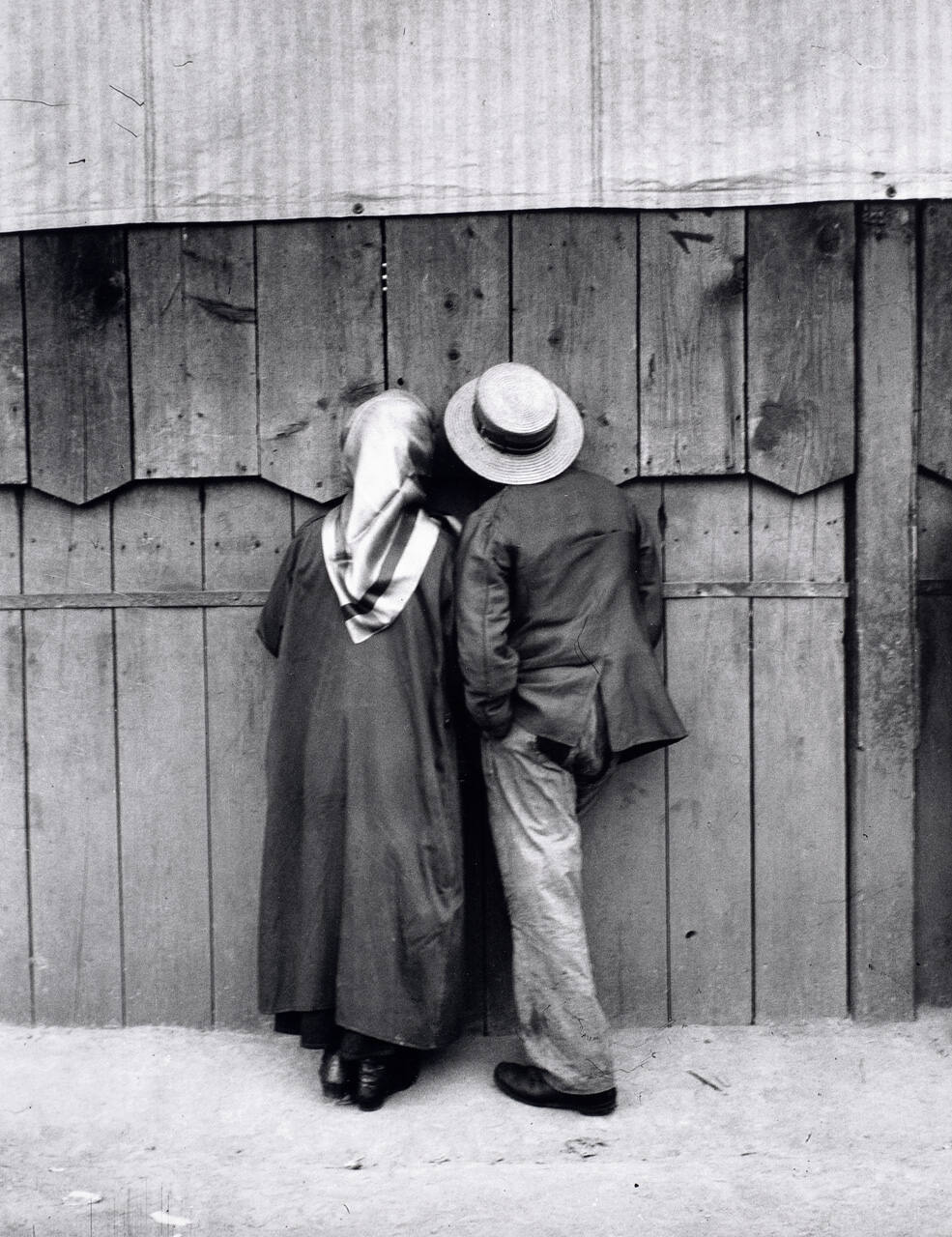 DescriptionImage of a man and a woman looking through a hole in a wood-paneled exterior wall. The woman wears a long dress while the man wears pants with a jacket and wide-brimmed hat.Exhibition HistoryA Tribute to André Kertész. Hallmark Photographic Collection, Kansas City, MO, October – December 1895.