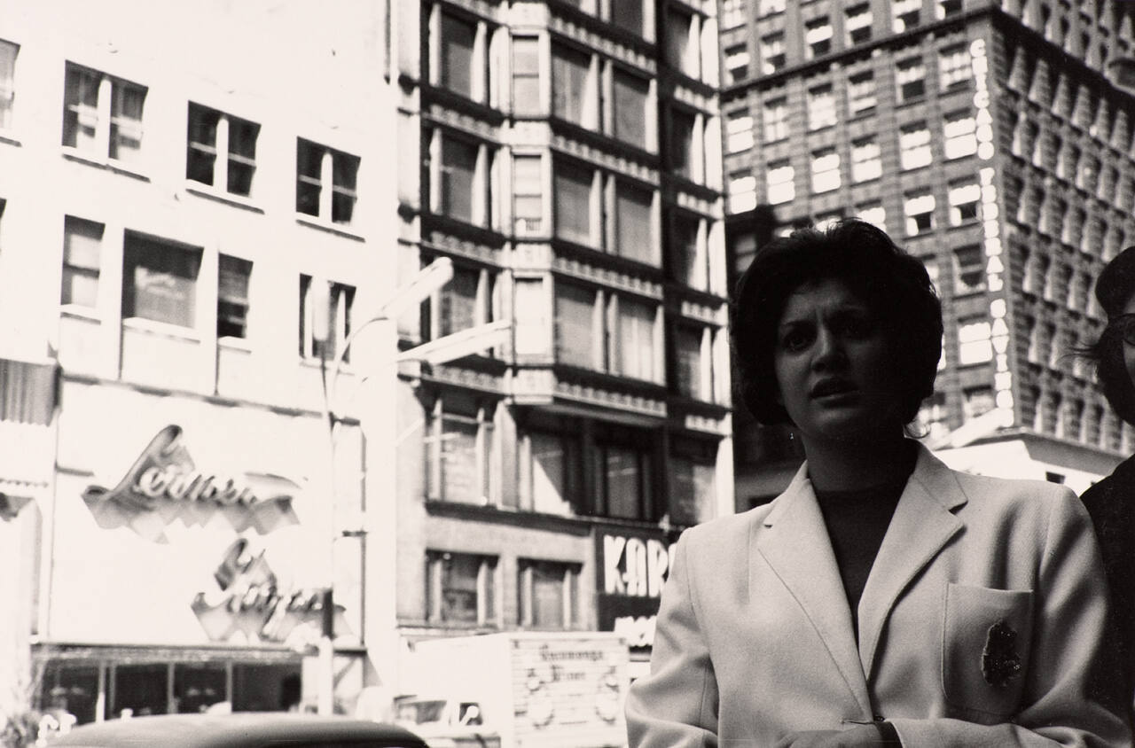 DescriptionImage of a woman with her face obscured by a shadow; tall buildings fill the background.Copyright© The Estate of Harry Callahan. Courtesy Pace Gallery, New York.