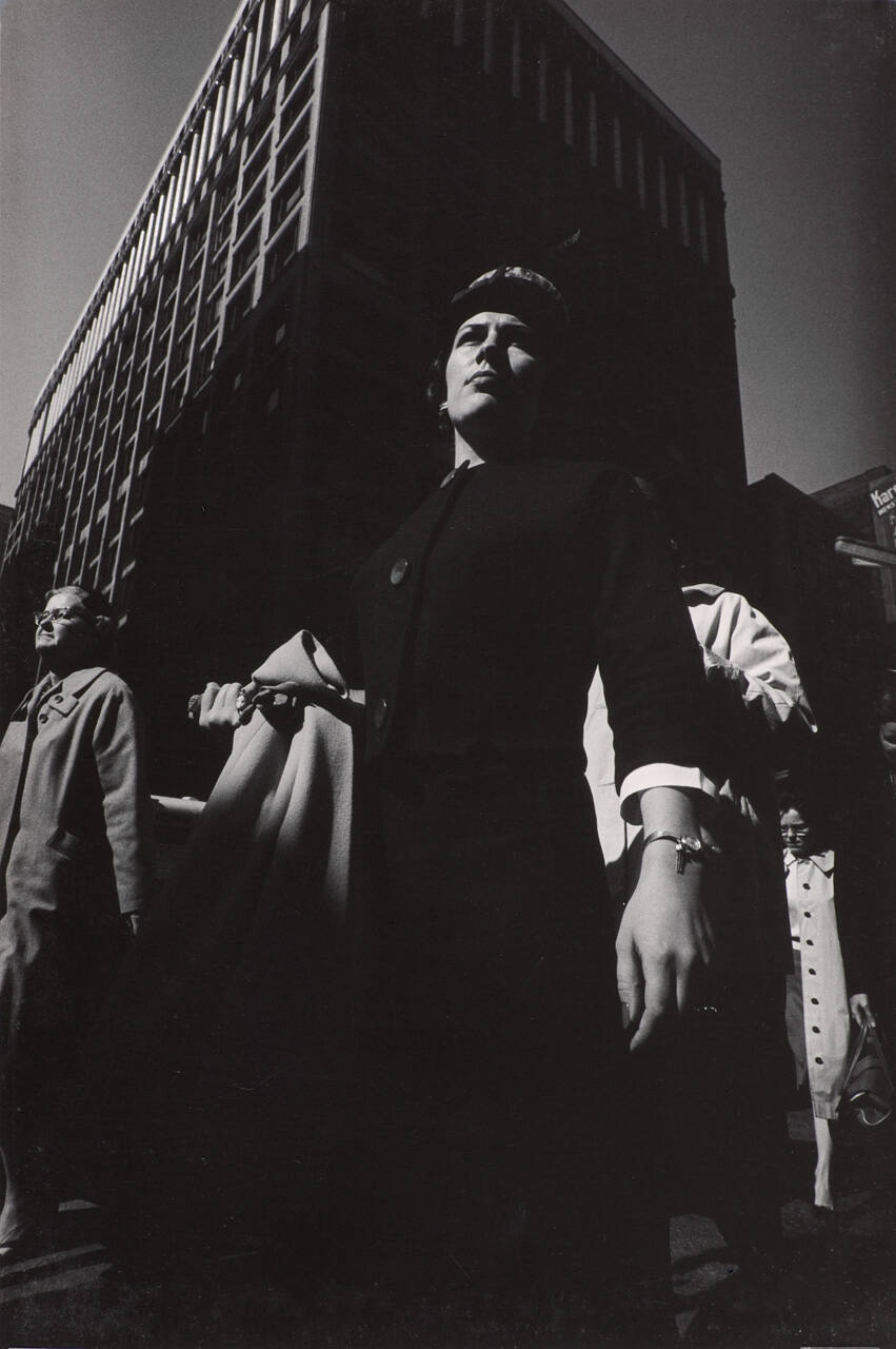 DescriptionImage of figures walking on a sidewalk with a tall building in the background; taken from a low perspective with harsh shadows on the figures.Copyright© The Estate of Harry Callahan. Courtesy Pace Gallery, New York.